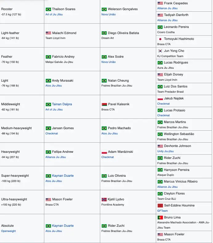 The following gives you a comprehensive overview of the weight classes in BJJ’s biggest bodies: